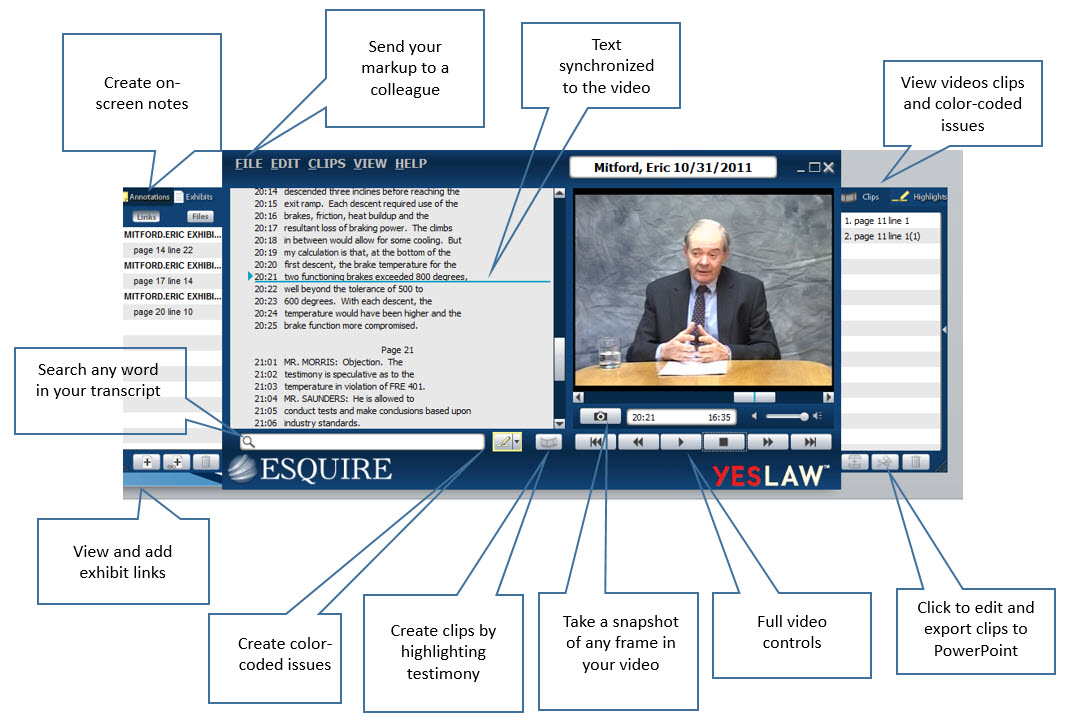 You can request EsquireView video for all synchronized video work. Users can view the videos, search, and create video clips for export to PowerPoint or other applications. We can provide EsquireView files either via download or by disc, by request.