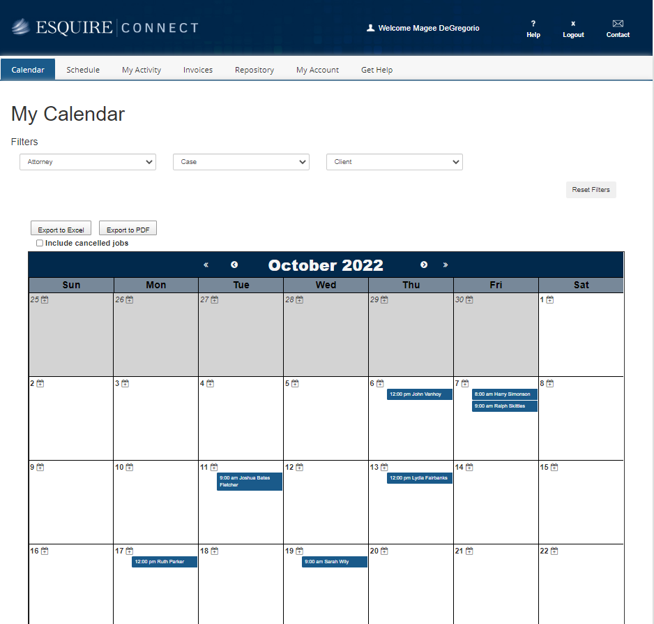 The Calendar displays your proceedings, from requested through completed. Your view varies depending on your role:
